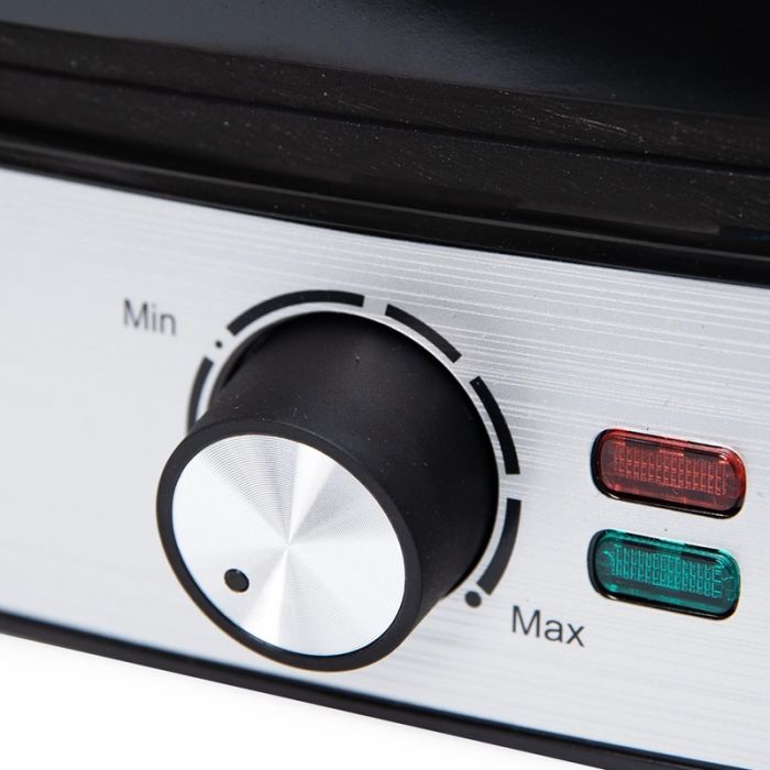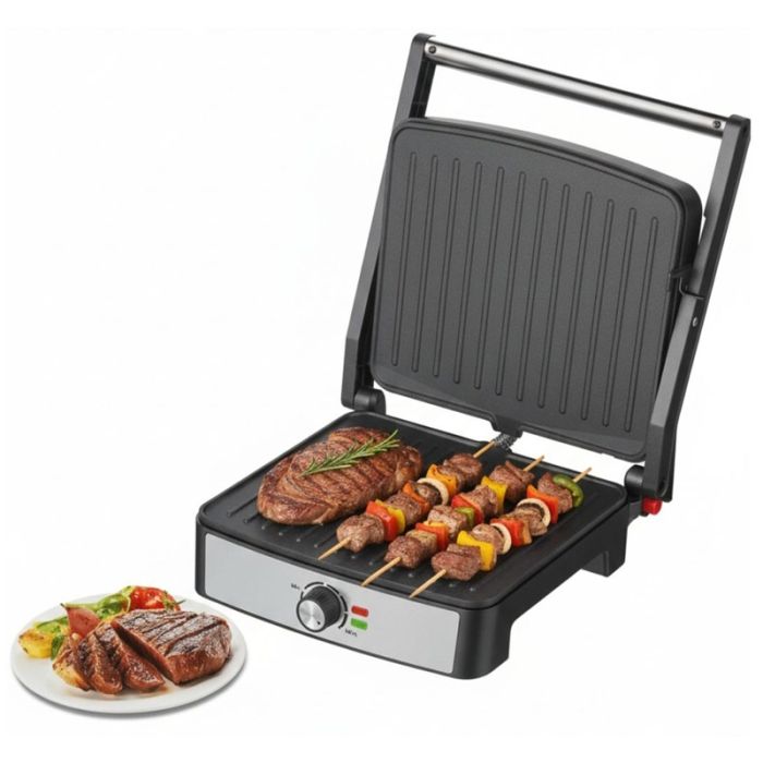 Gril à Viande FLORENCE - Puissance: 2200 Watts - Couvercle en acier inoxydable - Plaques à revêtement antiadhésif - Protection sécurité surchauffe - Poignée froide au toucher pour une sécurité optimale - Ouverture 180° pour usage en gril ouvert - Voyants lumineux - Pieds antidérapants - Charnière flottante automatique - Couleur: Chrome - Garantie: 1an