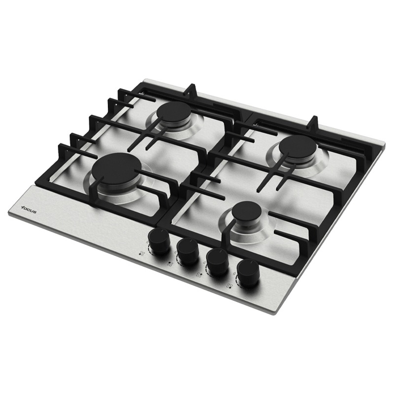 Plaque de Cuisson Encastrable FOCUS - Type de Plaque: à Gaz - Largeur: 60 cm - Nombre de feux: 4 feux - Grilles et chapeaux de brûleurs en fonte - Flamme stabilisée - Commandes Frontales - Allumage Automatique - Couleur: Inox - Garantie: 2 ans