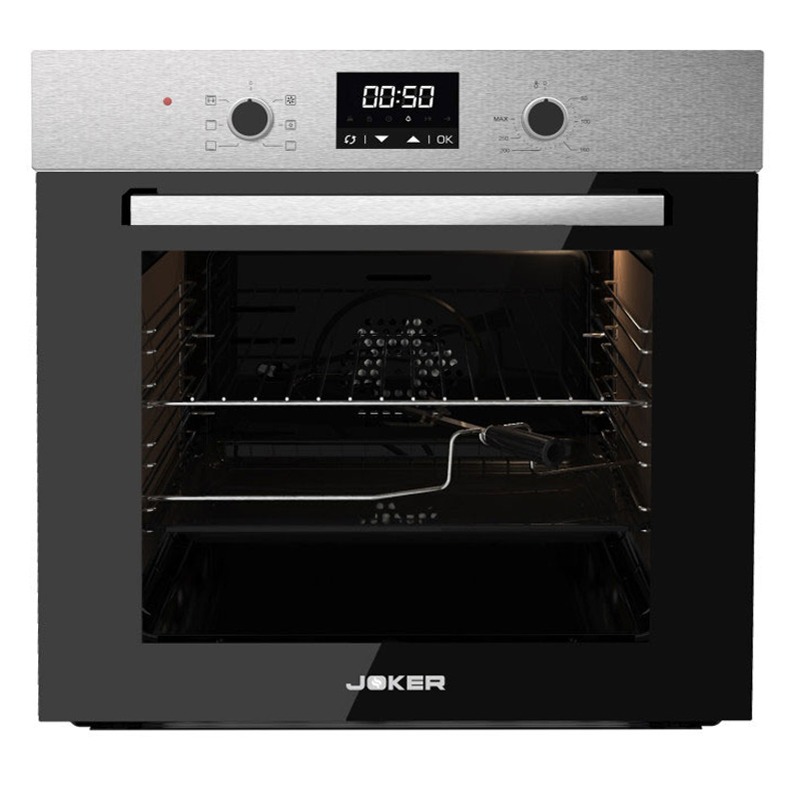 Four Encastrable Électrique JOKER - Largeur: 60 cm - Capacité: 66 Litres - 6 Programmes - minuterie Numérique - Afficheur Digital - Ventilateur turbo - Chaleur tournante - Thermostat - Refroidissement ventilateur - Porte amovible en verre intérieur (easyclean) - Panneau de commande inox - Poignée inox complète - Bouton-poussoir de minuterie numérique - Boutons POP-UP avec anneau inox (noir) - Tourne broche - Lampe de four - Plateaux rectangulaires - Couleur: Inox - Garantie: 2 ans