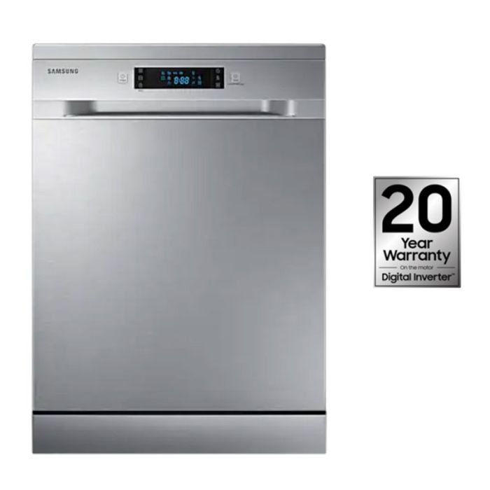 Lave vaisselle SAMSUNG - 13 Couverts - Consommation d’eau par cycle: 12 litres - Moteur de circulation: 98W - Classe d’efficacité énergétique: A+ - Consommation d’énergie annuelle: 295 kWh - 5 programmes de lavage - Niveau sonore: 48 dBA - Tension: 220 - 240 V / 50 Hz - Pompe de vidange: 30W - Grand écran: LED - Temps de lavage et séchage: En 60 minutes - Ajustable en hauteur - Picots rabattables(panier inférieur) - Aqua stop - Étagères à tasses rabattables - Dimensions: 598 x 845 x 600 mm - Poids: 49 kg - Couleur: Silver - Garantie: 2 ans + 20 ans sur moteur